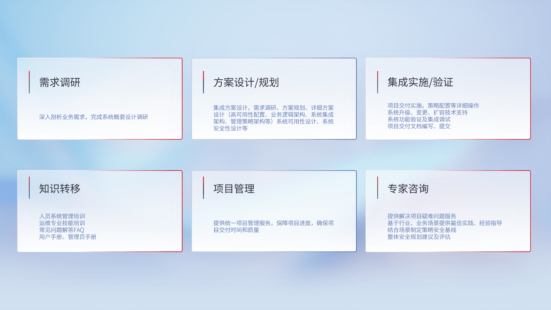 针对客户行业特性,,,,将宏观的安全战略和需求,,,通过专业的交付服务,,实现项目落地,,,为客户提供标准规范的集成交付服务。。